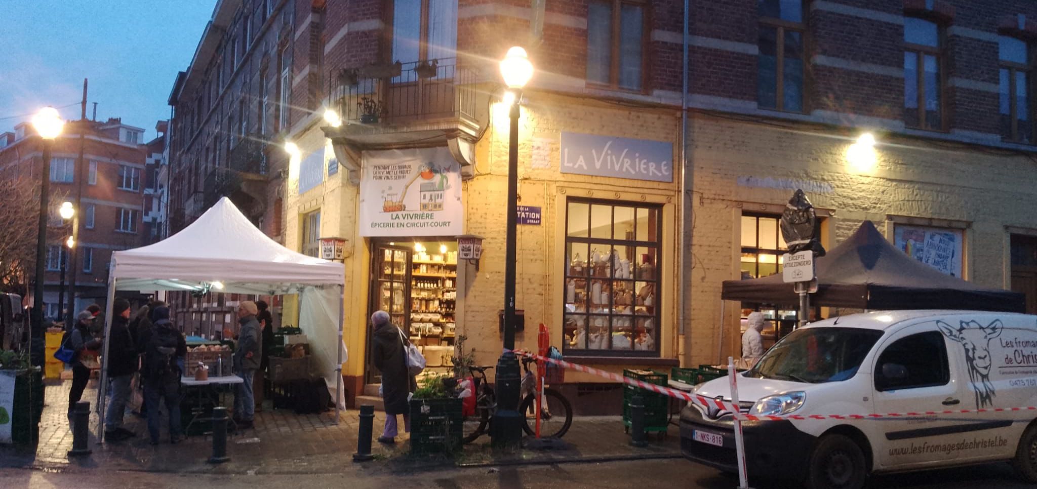 ...le chantier avance : "plus que" 11 mois de travaux...! mais ce seront les plus pénibles pour nous vu qu'ils vont vraiment être devant la porte petit à petit. Disons qu'on va faire une maxi fête une fois que ce sera terminé, avec une belle bamboule sur ce beau parvis tout neuf et son kiosque qui sera de notre côté de la place prochainement. En attendant, on continue de s'adapter et la distribution se fait rue de la Station, le long du magasin.