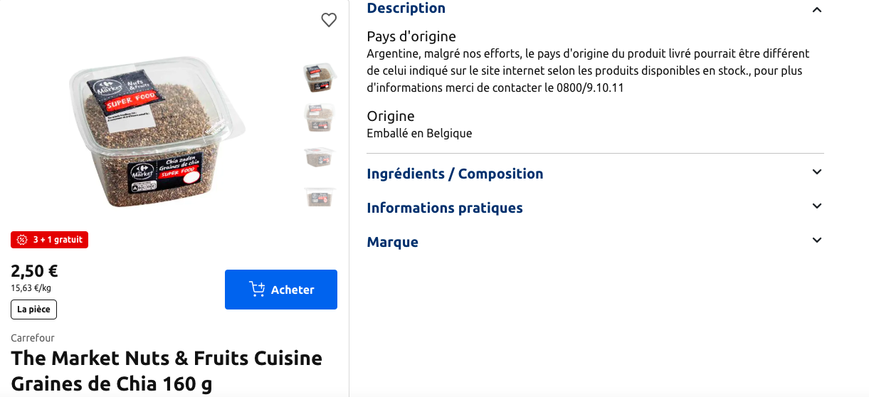 Petit comparatif : 15.63€/kg NON BIO, au GB Gatti de Gamont, origine Argentine 25.16€/kg bio, au Colruyt Stalle, origine non communiquée (UE/nonUE) 10.25€/kg au magasin en vrac, bio, origine Panama 22.80€/kg en ligne via Alliance Bio, origine France | | |