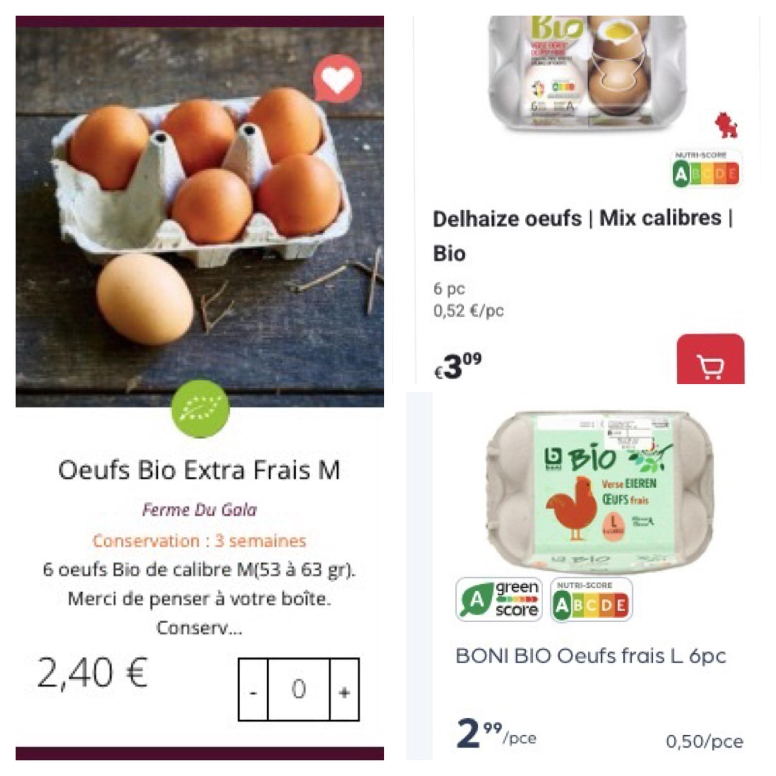 > Ignace de la Ferme du Gala n'avait pas touché au prix de ses oeufs depuis des années... avec la crise pétrolière, il faut être réaliste, une augmentation devait avoir lieu. On ne trouve plus depuis bien longtemps 6 oeufs bio à 2.18€ nulle part... alors même si nous sommes en circuit-court et que ce mode de consommation est de loin moins cher, les 6 oeufs bio seront dorénavant à 2.40€ afin de permettre à Ignace de gérer les augmentations des charges liées à la crise aviaire et aux gazole nécessaire pour ses tracteurs et la production des céréales. | | |